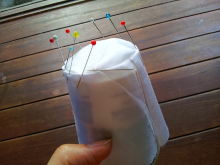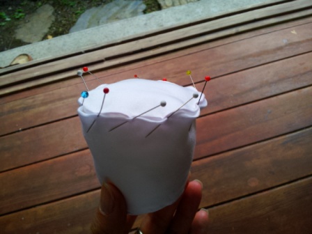 カップが抜け落ちないように、木の土台を白いサテンでくるんで、縫い付けて完成しました~♪