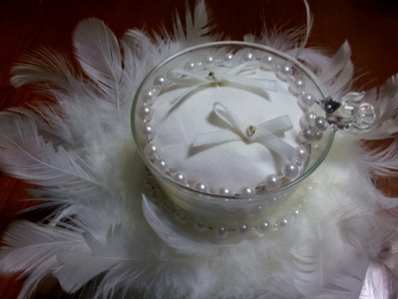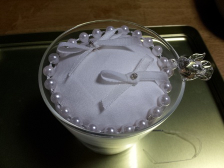 リングをひっかけるリボンと、パールを縫い付けてクッション完成~!!