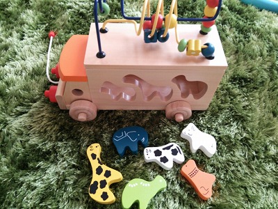 このおもちゃはひっぱって遊んだり、型はめ遊びやビーズ遊び、そして動物たちでごっこ遊びもできるんです!