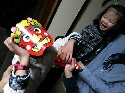 最初鬼のお面に娘はこわがって泣いていたのですが、最後には豆でではなくおもちゃの刀で鬼を退治してくれました 笑