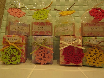 コラージュフラワーは色合いも可愛くプチギフトにおすすめ。ワイヤーカゴに入ったきゃんでぃーはハートがいっぱいちりばめられていて