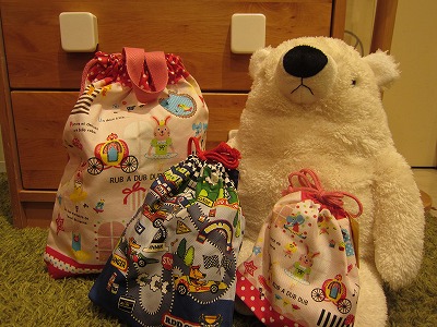 こちらは小物や着替えを入れるのに便利な巾着3サイズ。