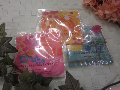 ハーブとバスソルトが袋に入っていて軽くもみだしながら使います!