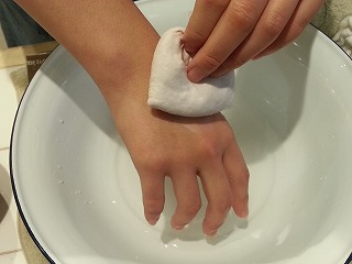 そして、顔や手などお肌にこんにゃくをあててクルクルなでると、
