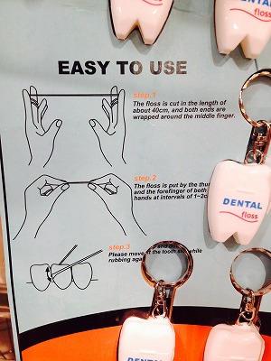 金具で切って指に巻きつけて、歯の間に挟んでフロスします。