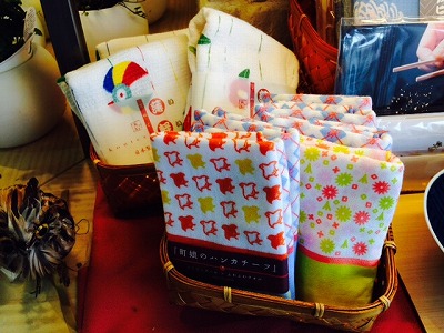 町娘のハンカチーフ(手前:500円+税)、タオルてぬぐい(奥:600円+税)