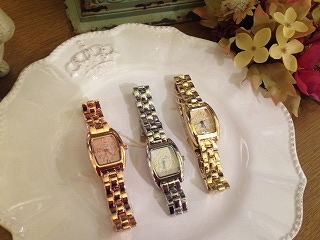 こちらはとてもシンプルなのですが文字盤に色がついていてシンプルな中にも華やかさを出してくれています。