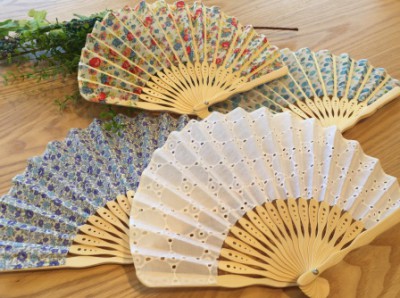 こちら、繊細なガーゼの素材の扇子「ふわり扇子」
