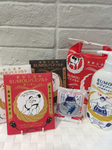 右から、SUMOUボディソープ、SUMOUバスソルト横綱セット、SUMOUワセリン、SUMOUバスソルトです。