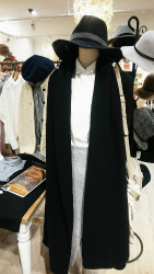 タイトスカートと真っ黒のフードコートと合わせた大人スタイルにも。