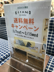 現在開催中の第1弾は2/15日まで、KITONO家具のお届け、組立、設置と、家具梱包材の撤去が無料のフェアがスタートしております。