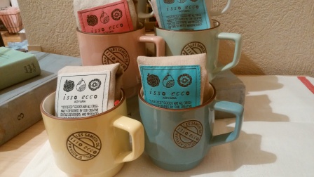 お次はこちら、春らしいパステルカラーの巾着付マグカップ。