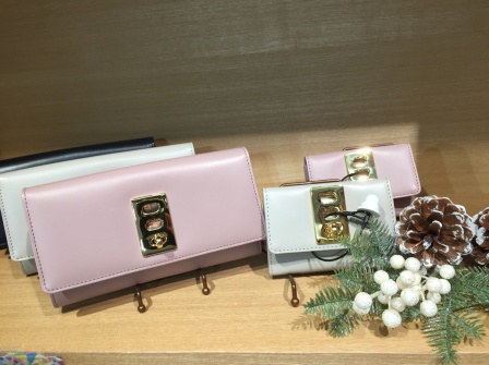 3つのひねり金具がポイントで、ハリのある滑らかな質感の革を使用。