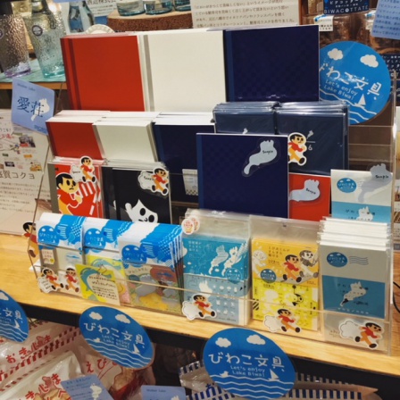 愛荘より、滋賀コクヨさんから、滋賀県発祥の交通看板”飛び出し坊や”こと「とび太くん」とびわこの文具。琵琶湖のヨシを使い、エコに配慮した文具もございます。