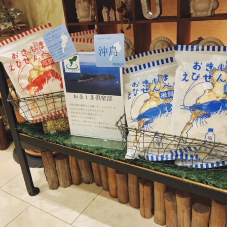 沖島より、おきしま倶楽部さんから地元漁師さんが獲ったスジエビをふんだんに使ったえびせんべい。マヨネーズ味としお味、どちらもスジエビの風味が抜群で、スタッフもリピ買いするほどやみつきになる美味しさです。