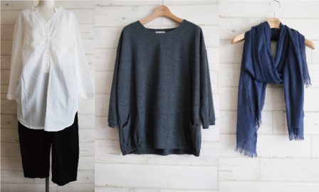 人気ブランドmashukashuのカットソー、コットンチュニック、パンツ、ストールのオールシーズン着まわせる着回し抜群のセットです。