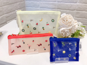 こちらはチュールポーチ。これからの旅行シーズンにピッタリのメッシュ素材です。季節感のある可愛らしい柄が刺繍で表現されています。
