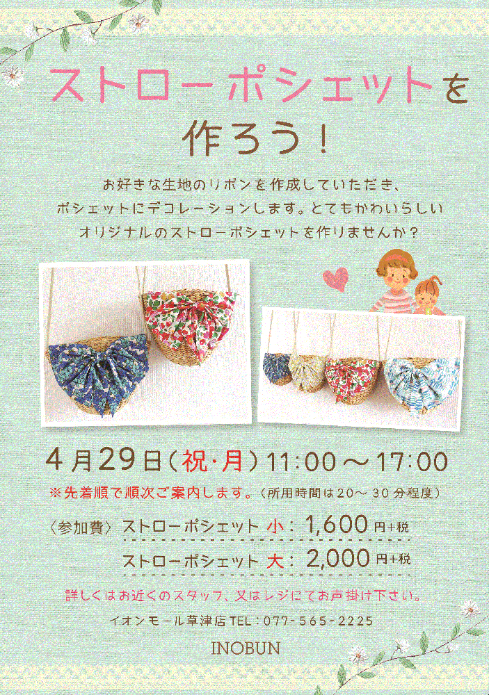 毎回大人気のワークショップですが、今回は、オリジナルのストローポシェットを つくっていただけます。作り方は、簡単で、お好きな生地のリボンを作成していただき、 ポシェットにデコレーションします。とてもかわいらしいストローポシェットを作りませんか?
