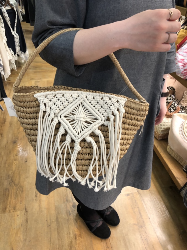 丁寧に編み込まれたマクラメが美しく、優しい雰囲気で女性らしさを演出してくれるカゴバッグ。フリンジが印象的です。