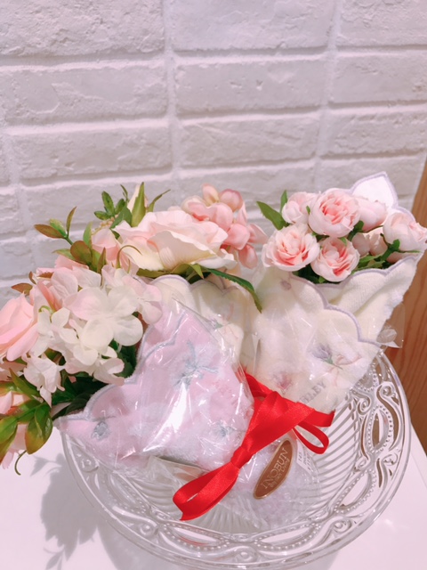お次はローラアシュレイのタオルハンカチでブーケ風にしてみました♪こちらも今年大人気です^_^ハンカチは日常使いに、造花はインテリアに♪¥1050+税~