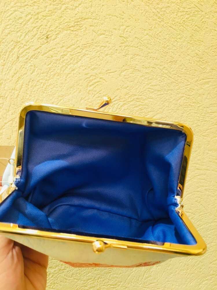 コロンとした形で口が大きいのでコスメなどもたくさん入るのが魅力的。中の布地はブルーになっています。