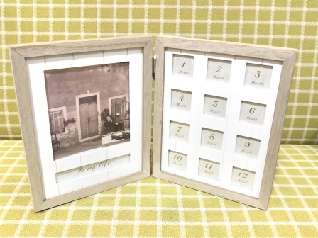 1つ目は小窓が12枠と大窓が1枠の折りたたみ式フレームです。お子様が生まれて1年間の成長を飾るも良し、お2人の出会いをまとめて結婚式のウエルカムボードにするもよし、小窓には何も書かれていないので使い道がぐっと広がります♪