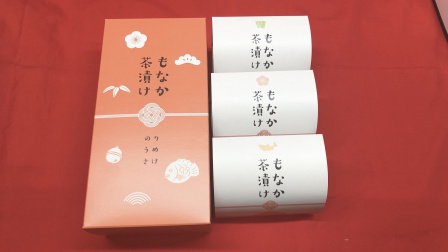 めでタイ!鯛の形をしたもなか茶漬けです。 ご飯に乗せてお湯やお茶を注ぐだけであっという間にお茶漬けの完成です。 のり、うめ、さけの三種セットです。