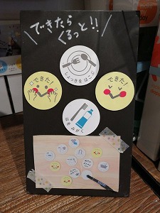 ボードの右側に「やること」を順番に貼って、左側に時間を決めて書き込むだけで完成!時計の横に並べて一緒にできた!を増やしていきましょう。
