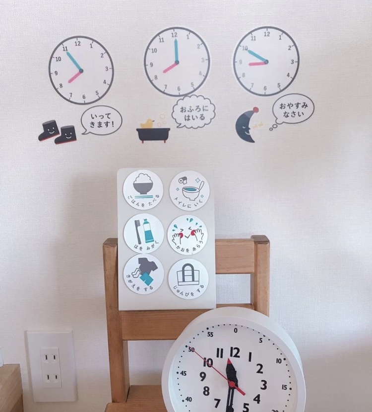 子どもと一緒に楽しく学ぶをテーマに作られた「できたよマグネット」や「時計のウォールシール」。