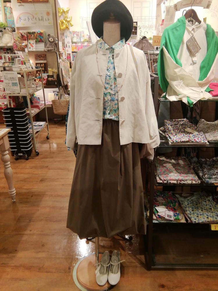 白のジャケットにリバティのシャツ、裾のひろがった愛らしいスカートを