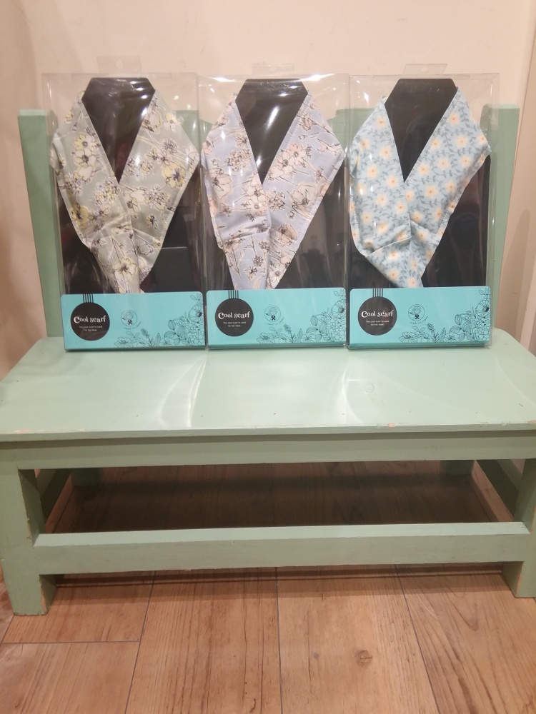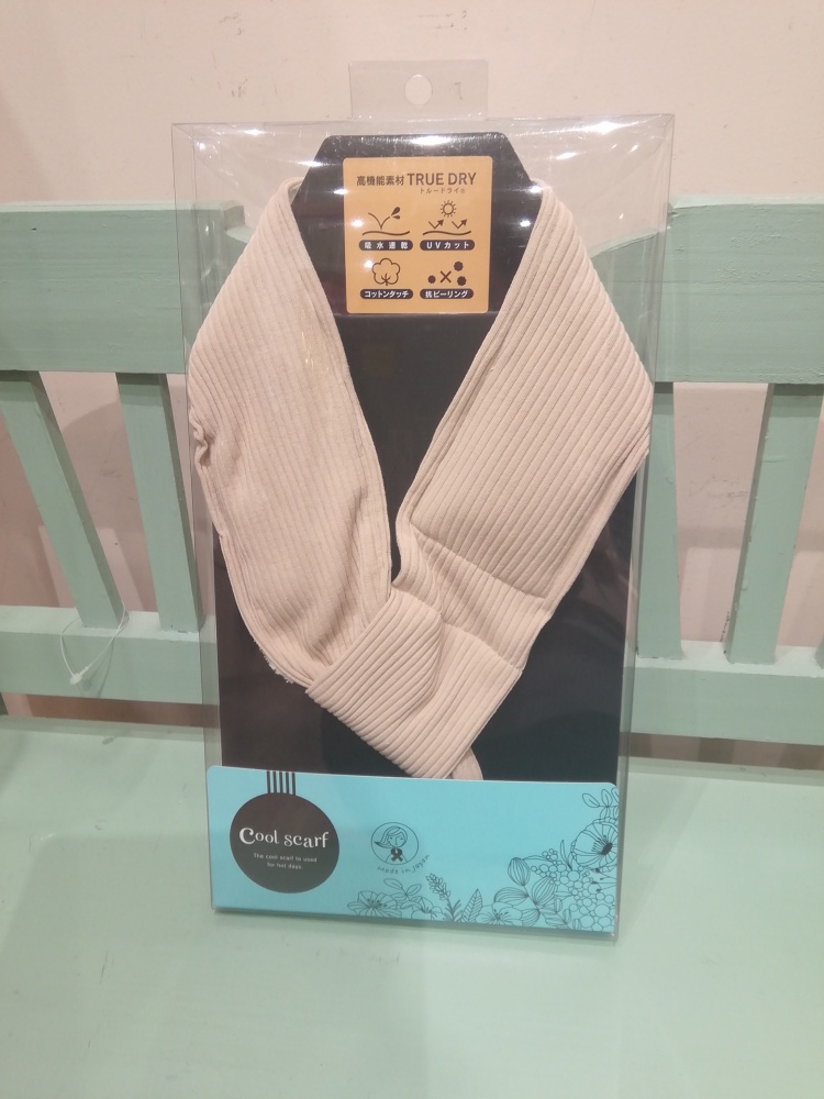 まずは、こちら! クールスカーフです。お散歩や家事、ガーデニング中、首からひんやり体を冷やしてくれます。