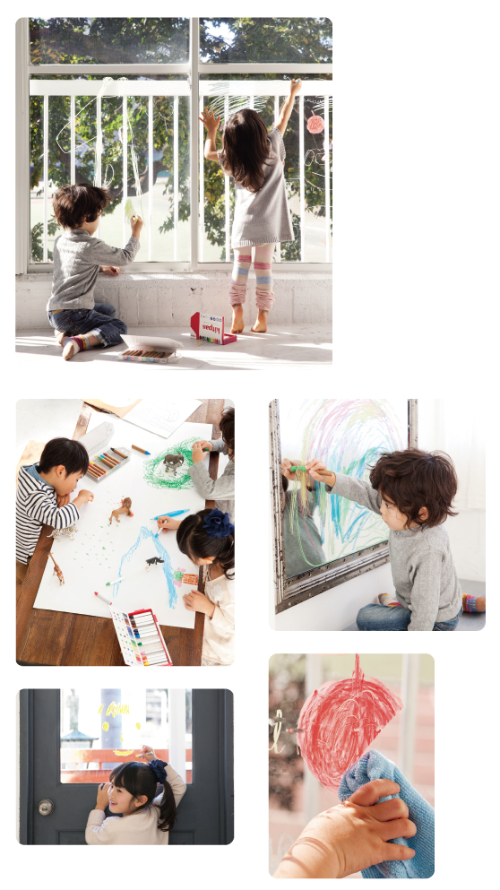 ところに描いて濡れた布で消せます。窓ガラスいっぱい、親子で