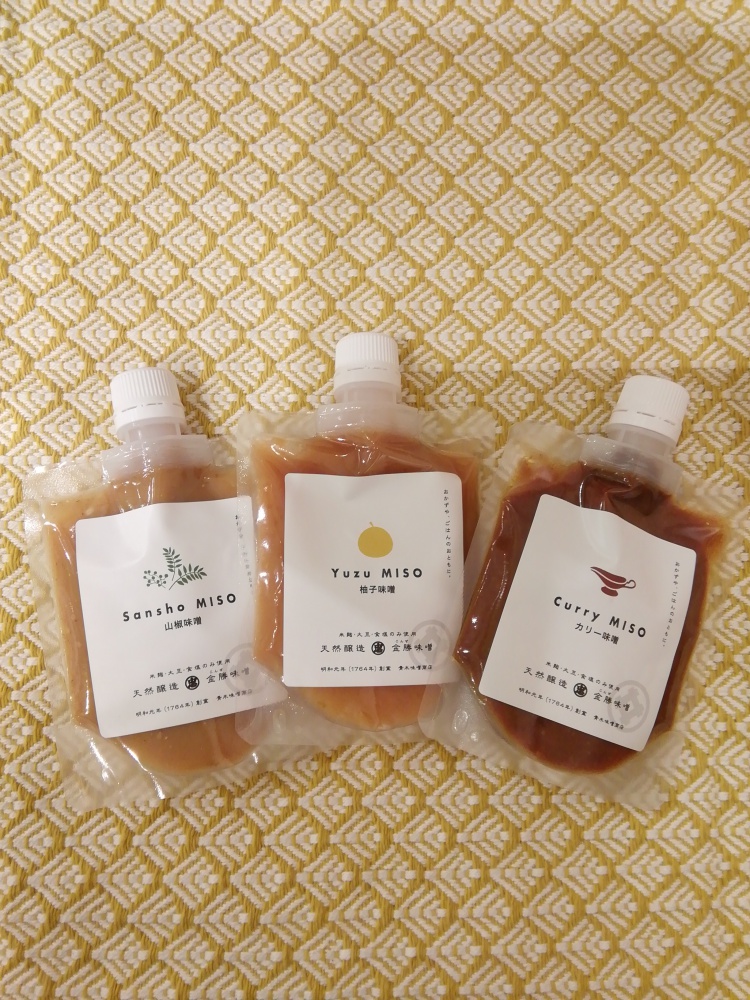 ベーシックな米麹味噌、粗挽きの大豆で作った田舎粒味噌、コク深い黒豆味噌をご用意しております。