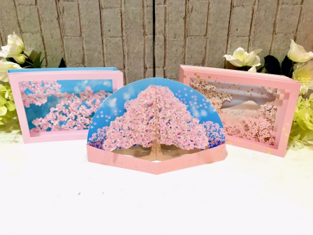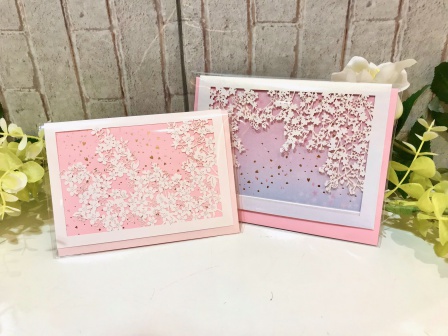 まずは、広げると立体的になるカードです。繊細な切絵が春らしく、層が作られていて奥行きを感じられるカードになっています。封筒もついていますので入学式やお誕生日のお祝いなどに送ることもできます♪