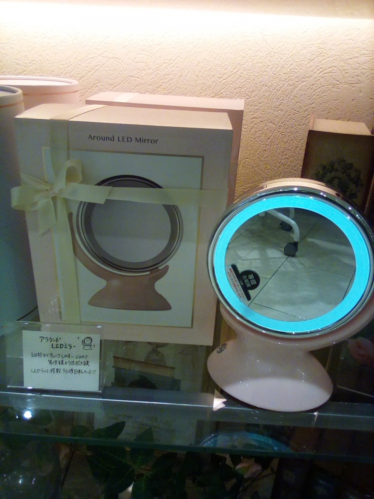 最後に当店オススメの「アラウンドLEDミラー」です。細部までチェックしやすい 等倍鏡&5倍拡大鏡の2WAYミラー。アイメイクをするときに便利な拡大鏡つきでLEDもついております。