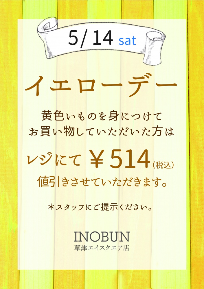 当日、当店で黄色いものを身に着けて1000円以上、お買い物をされたお客様に、レジにて514円(税込み)値引きいたします!