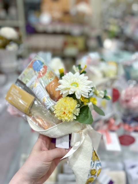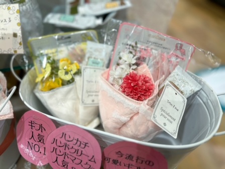 お菓子やコスメをお花とハンカチで包んだブーケギフトは大人気!