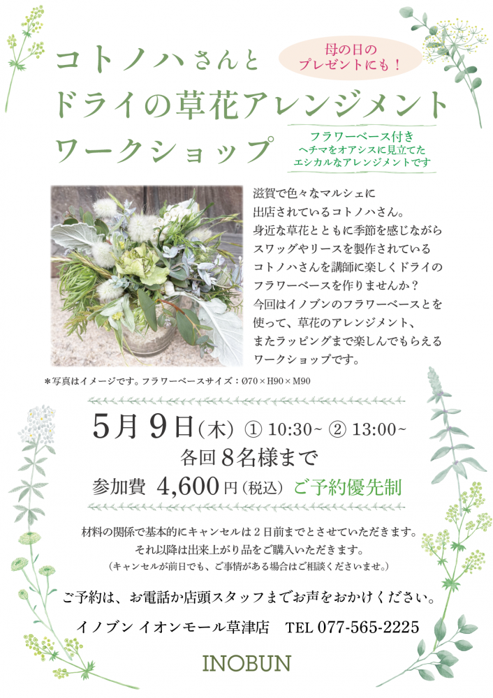 また、明日5月9日(火)はドライの草花アレンジメントイベントも開催いたします。滋賀で様々なマルシェに出店されているコトノハさんを講師にお迎えしての大人気イベント♪今回は、母の日の贈り物にぴったりのフラワーベースでのラッピング付きです。
