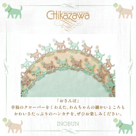 幸福のクローバーをくわえていたり、足元に肉球と「おさんぽ」の文字が入っていたりと細部までかわいさがたくさんつまったハンカチです♪
