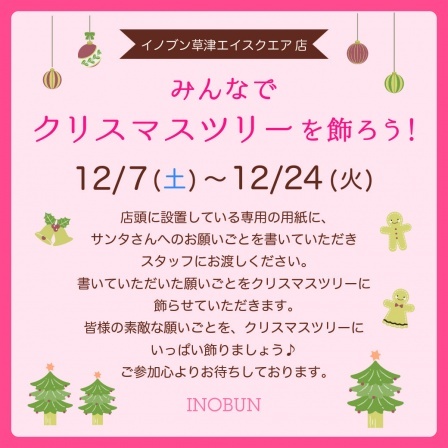 イノブン草津エイスクエア店では、サンタさんへ届くようにみなさんの素敵な願い事をツリーに飾らせていただきます!