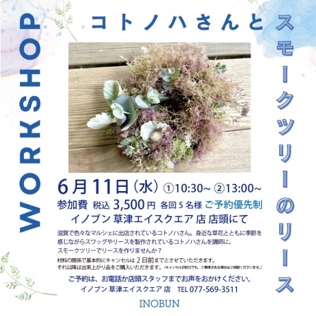 コトノハさんとスモークツリーのリース ワークショップ 6月11日(水)①10:30~ ②13:00~ 税込3,500円 イノブン草津エイスクエア店 店頭にて