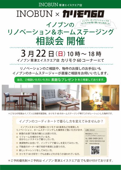 日時 3/22(日) 10時~18時 イノブン草津エイスクエア店 カリモク60売場にて 料金:無料