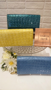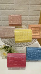 こちらは同じくギャルソン型のエナメル加工です。薄型なのに収納力が抜群です。クロコ柄の凸凹が、光を乱反射させ美しさを引き立てます。