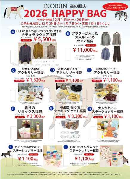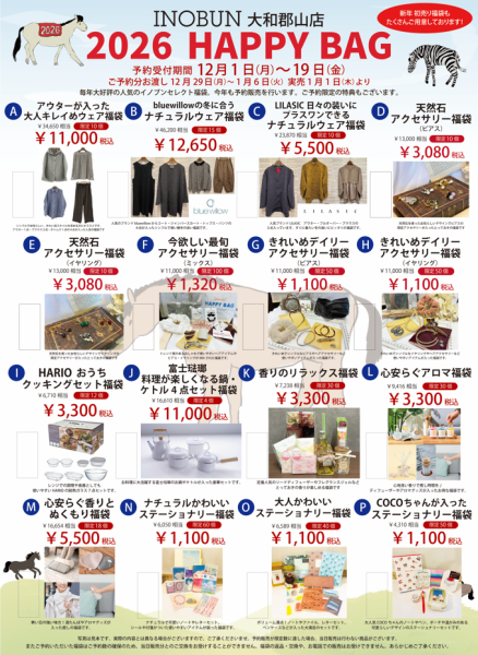 本日はイノブン大和郡山店より、来たる2026年の幕開けを飾る、嬉しい福袋予約のご案内です。明日12月1日(月)より予約が始まります。