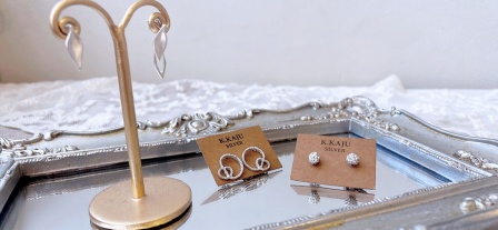 京都のアクセサリーブランドK.KAJUのアクセサリーは、自社工房にてひとつひとつ丁寧に製作されています。上質なアクセサリーをと、素材は純銀やsilver925、淡水パールや天然石を使用されています。