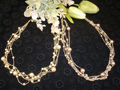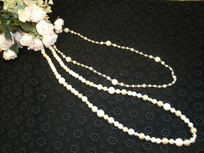 こちらはロングネックレス。手前のネックレスは3色のホワイトパールが大小組み合わされていてとてもステキです。ロングのままでも2連のチョーカーとしても幅広くお使い頂けそうです。こちらもINOBUNオリジナルです。(2940円)