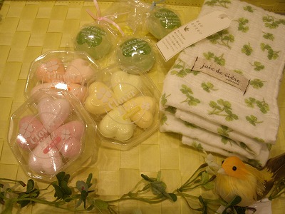 左奥にございますのが、四ツバのクローバーが入ったかわいいプチサイズのソープです。洗面所に幸せを運んでくれます♪お一つ126円。