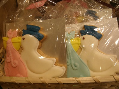 コウノトリさんが赤ちゃんが入っている袋を口ばしに加えています。幸せを運んでくれるクッキーです。