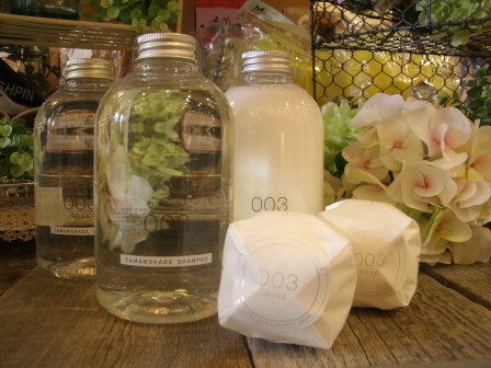 こちらは、お馴染みの《TAMANOHADA》のシャンプー&コンディショナー&リクイッド&ソープの003です。シャンプー&コンディショナー(各1470円)は、髪の自然治癒力を活かして、髪をもっと健やかにしてくれます。リクイッド(1260円)は、肌と同じ弱酸性なので、とてもやさしい洗い上がりです。ハンド用としても、また、シャンプー・コンディショナーと揃えて、同じ一つの好きな香りで、全身を包むようにして洗っていただけます。