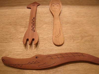 なんてかわいいんだろうと一目惚れしたカトラリーたちです。木のカトラリーが大好きなのでコレクションに追加されて大満足です。バターナイフとアイスクリームのスプーンなどです。